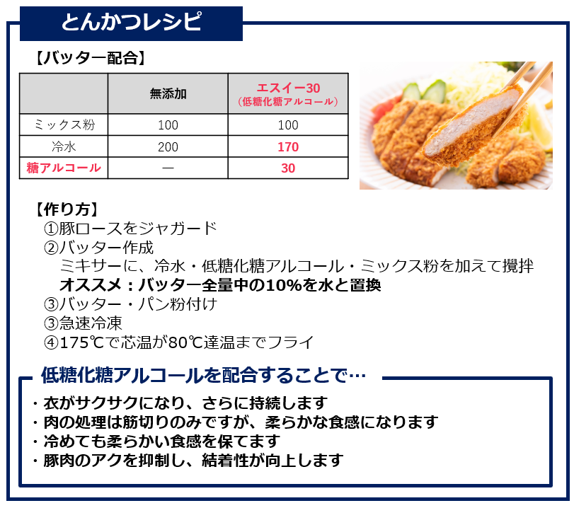 バッター液の水の一部をこのエスイー30に置き換えるだけで、衣のサクサク感がアップし、