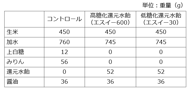 砂糖・みりんを使用した炊き込みご飯と比較し、糖アルコールを使用した炊き込みご飯は着色が低減することが分かった。