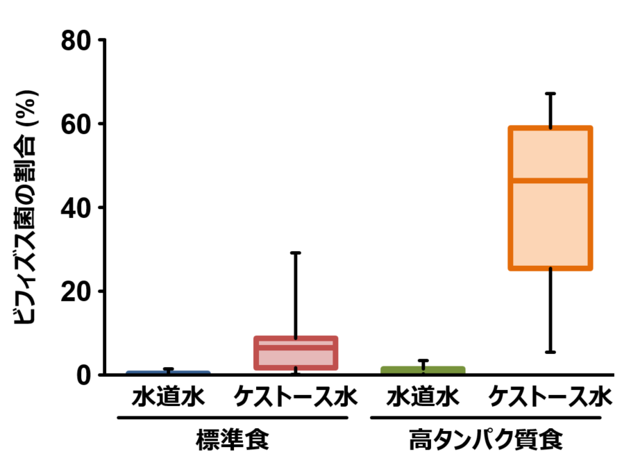 高タンパク質なエサとケストースの両方を摂取したグループでは、腸内細菌叢におけるビフィズス菌の割合が顕著に増加した。(図2)