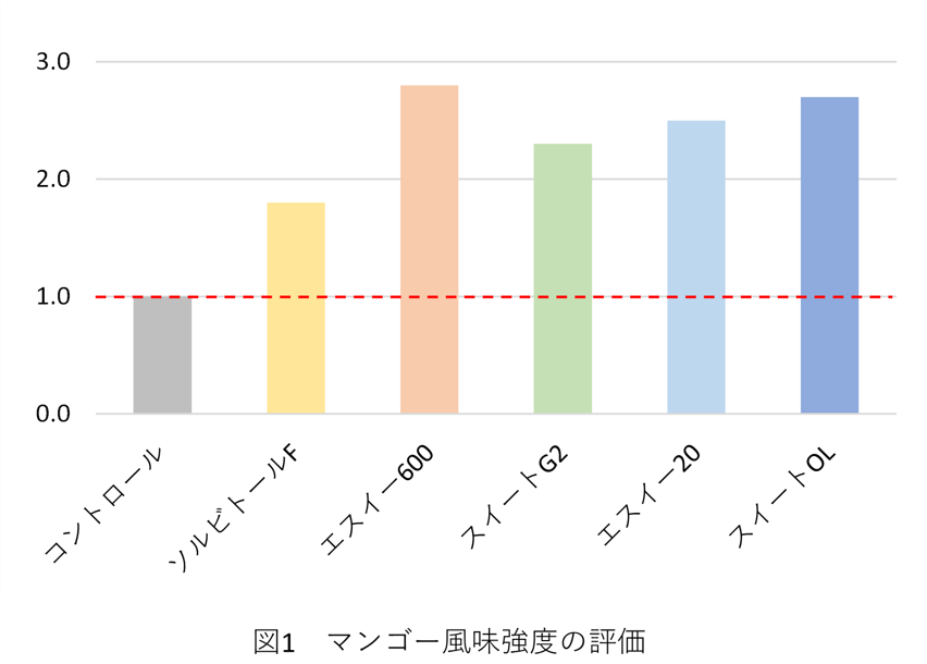 マンゴーピューレに、ソルビトールF、エスイー600、エスイー20、スイートG2、スイートOLを濃度が3%になるように添加した(コントロールは無添加)。これらのピューレについて、「マンゴー風味の強度」を評価項目とする官能評価を行った。
