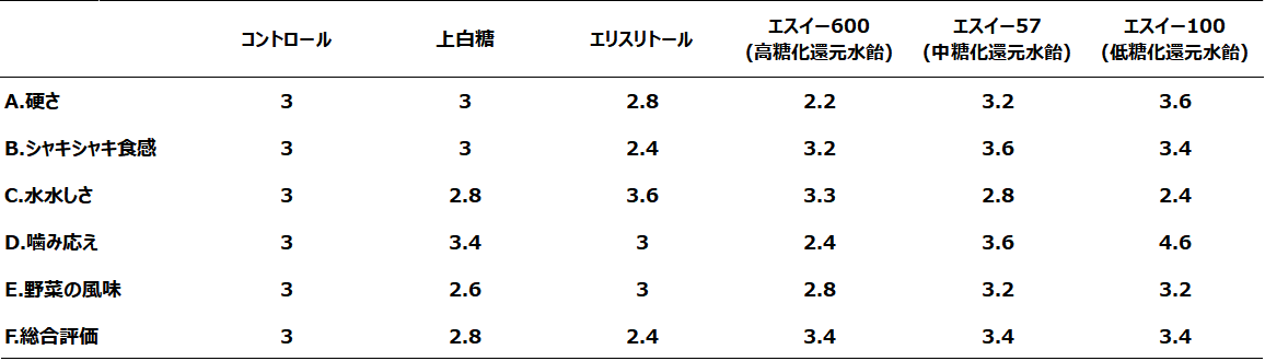官能評価:コントロールを3点として、各食感項目、野菜の風味ならびに甘さについて評価した。結果を表1に示す。
