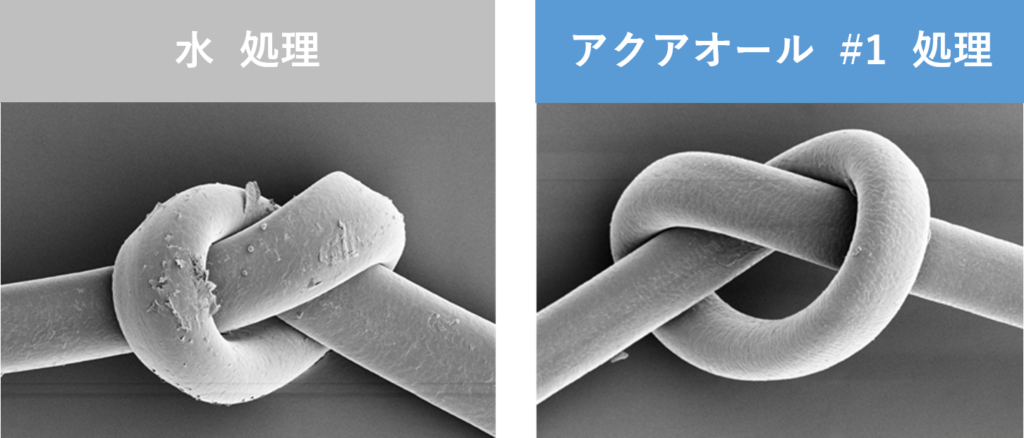 水のみでの処理と比較し、アクアオール#1処理検体のキューティクルの開きや損傷が抑えられていることが確認されました。