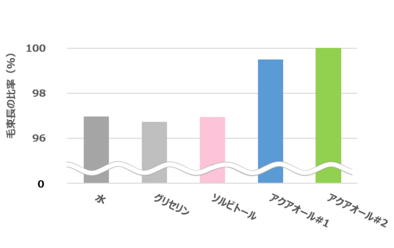 水又はグリセリン又はソルビトールで処理した毛束は、保管6時間後にうねり・広がりが発生し、毛束長が短くなっていました。アクアオール#1又はアクアオール#2で処理した毛束は保管6時間後でも毛束の長さが維持されており、高湿度下における、うねり・広がりを抑える効果が確認されました。(※特許出願中)