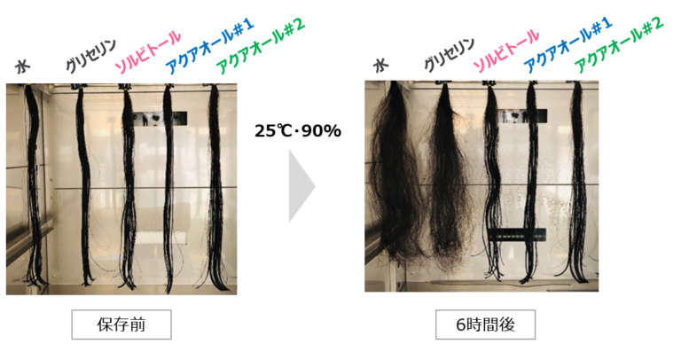 そんな毛髪のお悩みに対して、ソルビトールやアクアオール(表示名称:加水分解水添デンプン、水)を用いた効果の検証を行いました。