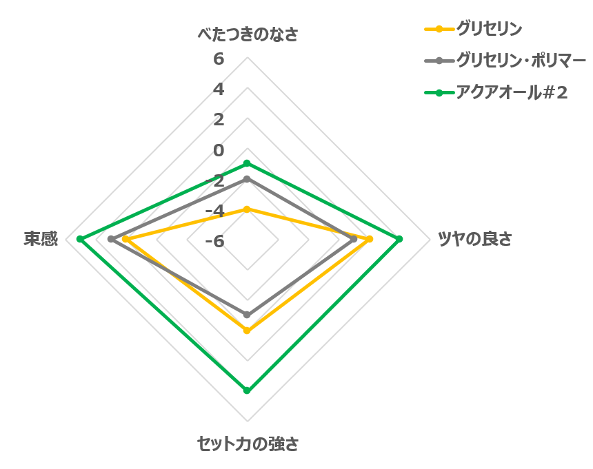 高分子ポリマーの添加により、グリセリン処方におけるべたつきの改善が確認され、一方で、アクアオール#2処方では、べたつきが抑えられ、適度な束感によりセット力の強さを感じる仕上がりとなることが示されました。