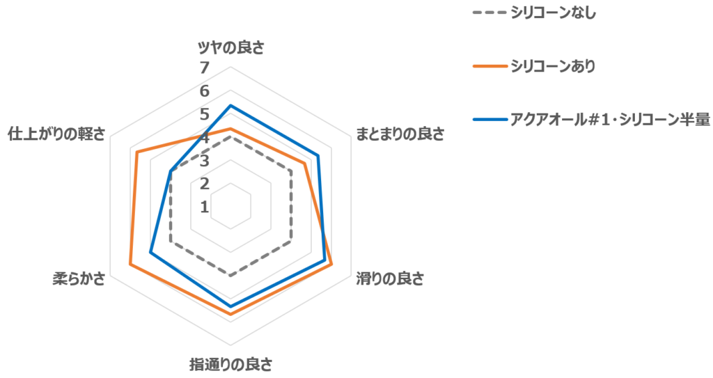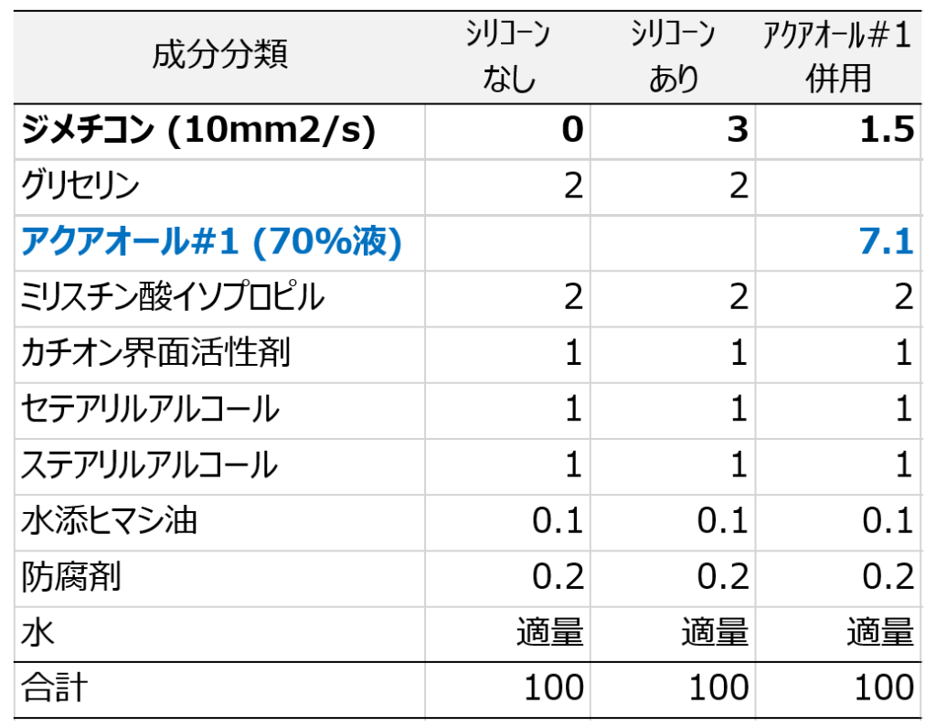 シリコーンあり処方は、シリコーンなし処方と比べて、『指通り・滑りの良い軽い仕上がり』が感じられました。一方で、アクアオール#1・シリコーン半量配合処方は、低重合度シリコーン特有の軽い仕上がりは劣るものの、『指通り・まとまりの良さ』が感じられました。