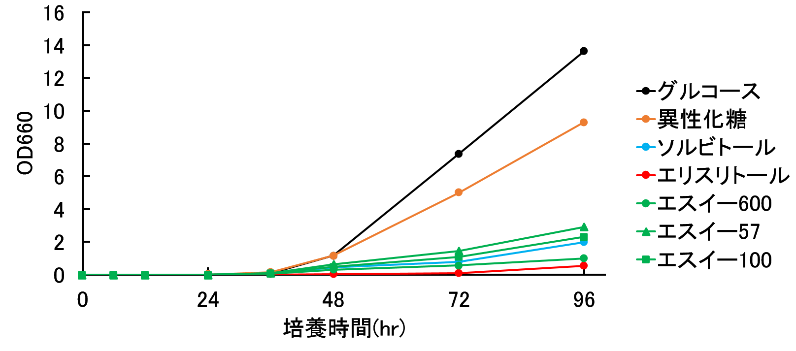 実験に用いた糖源は、グルコース(ポジティブコントロール)、一般的に用いられている糖源である異性化糖、