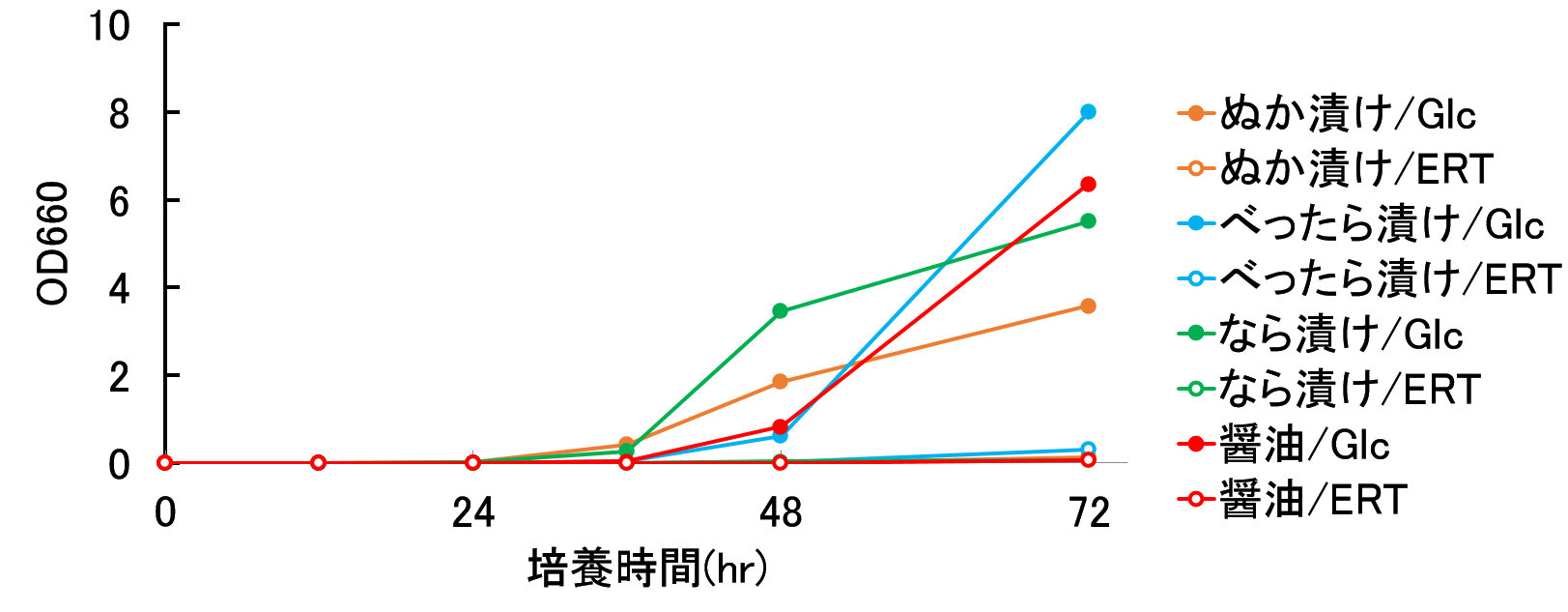 ①の試験にて最も効果の高かったエリスリトール(ERT)において、様々な食品由来微生物を培養した。