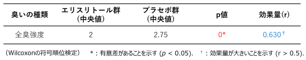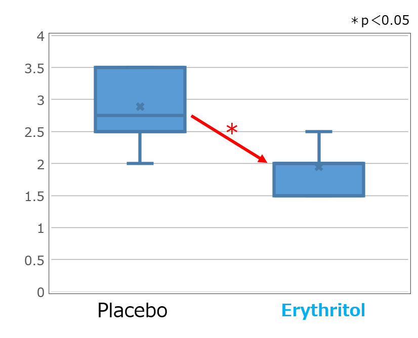 エリスリトール群とプラセボ群の臭強度スコアを中央値で比較すると、エリスリトール群のスコアが有意に減少した。