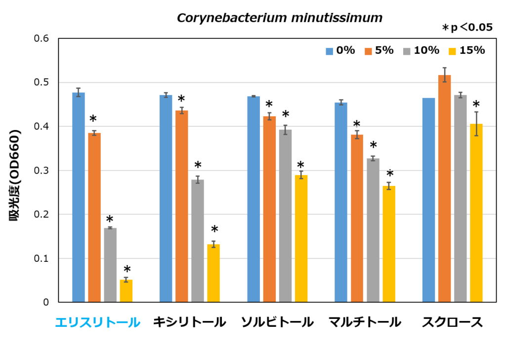 わかった。また、他の糖アルコールと比較してもエリスリトールが最も菌の増殖を抑制していた。