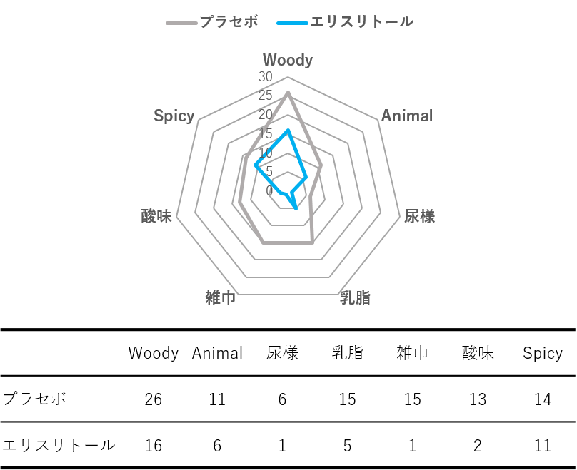 よって、臨床試験においてもエリスリトールが体臭を有意に抑制することが明らかになりました。